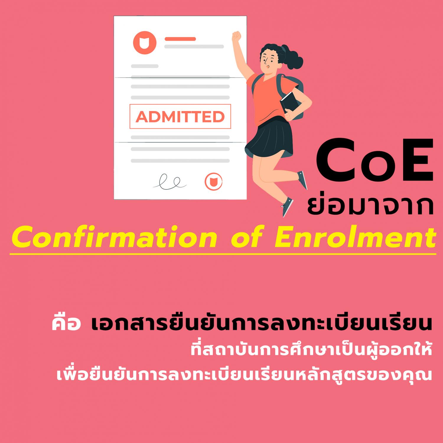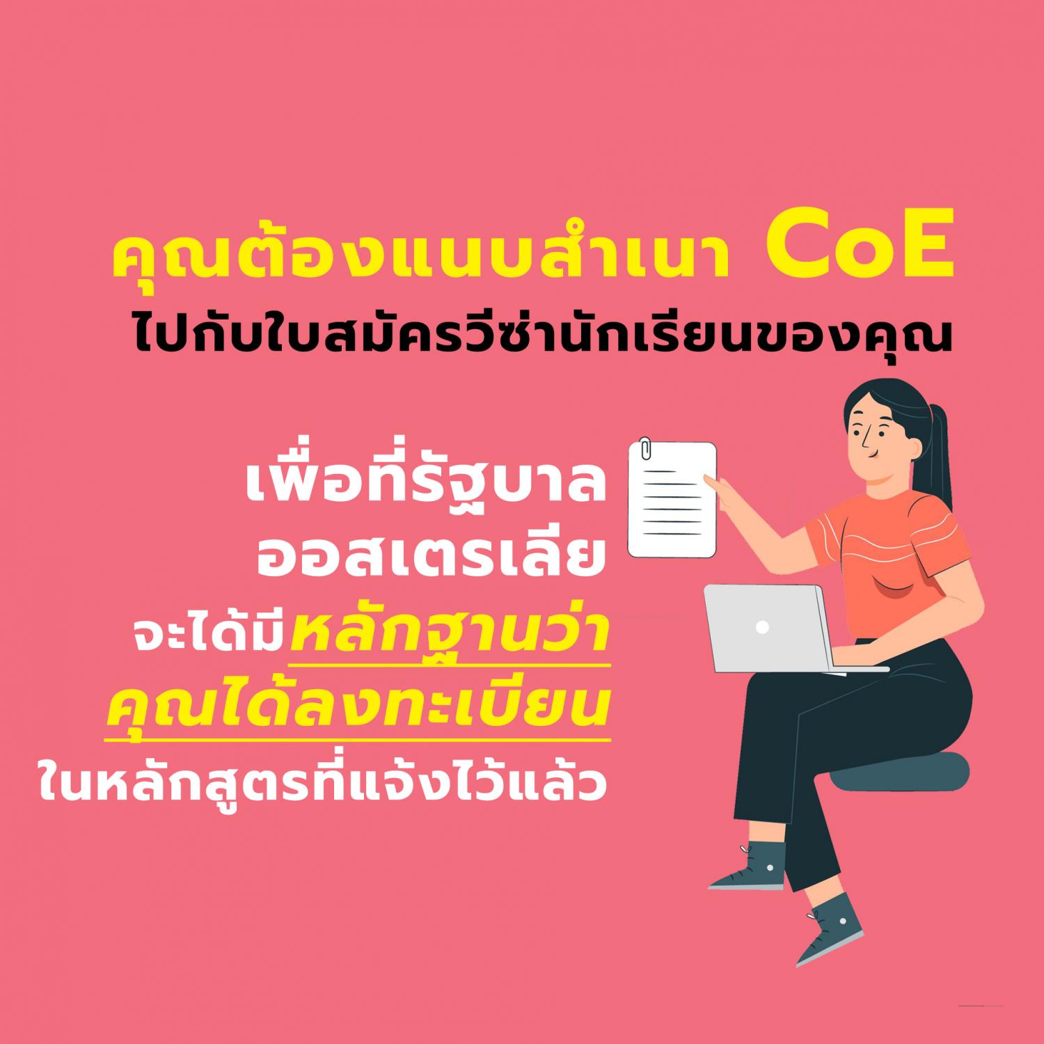 COE เป็นเอกสารสำคัญที่นักเรียนต่างชาติทุกคนต้องมี ก่อนยื่นขอวีซ่าเรียนต่อออสเตรเลีย หรือบางประเทศที่ใช้ระบบคล้ายกัน เพราะเป็นหลักฐานยืนยันการรับเข้าเรียนอย่างเป็นทางการจากสถาบัน